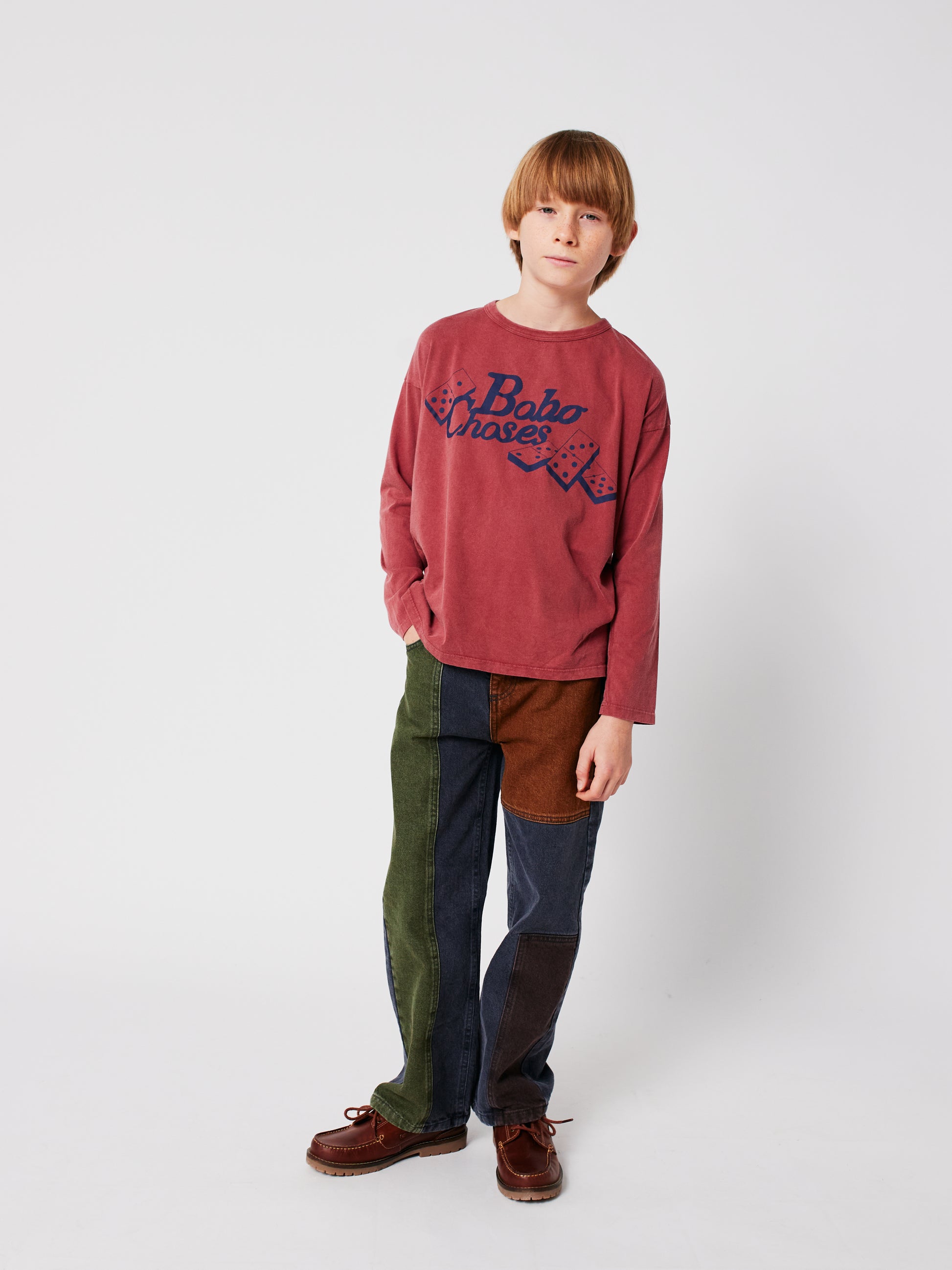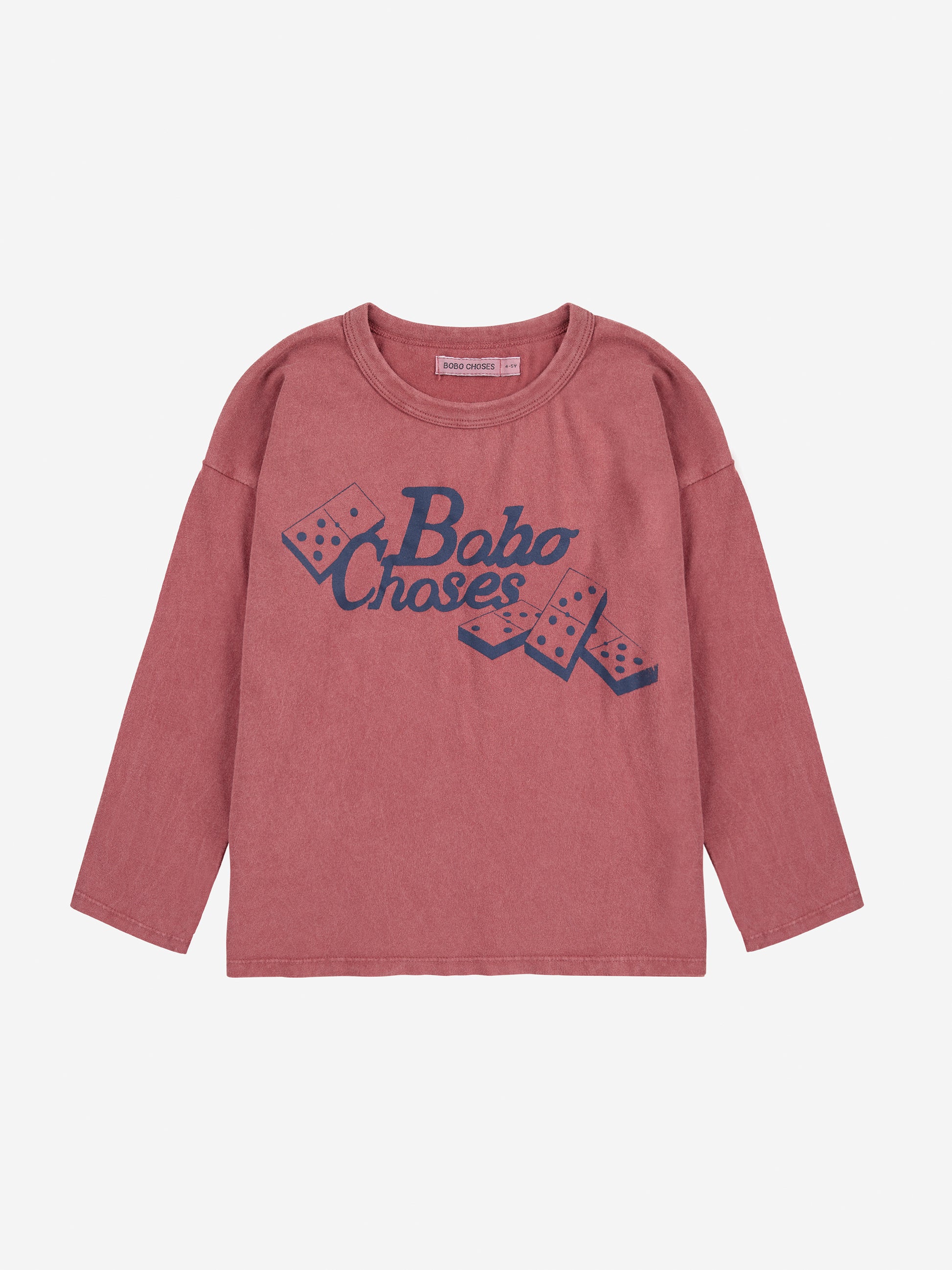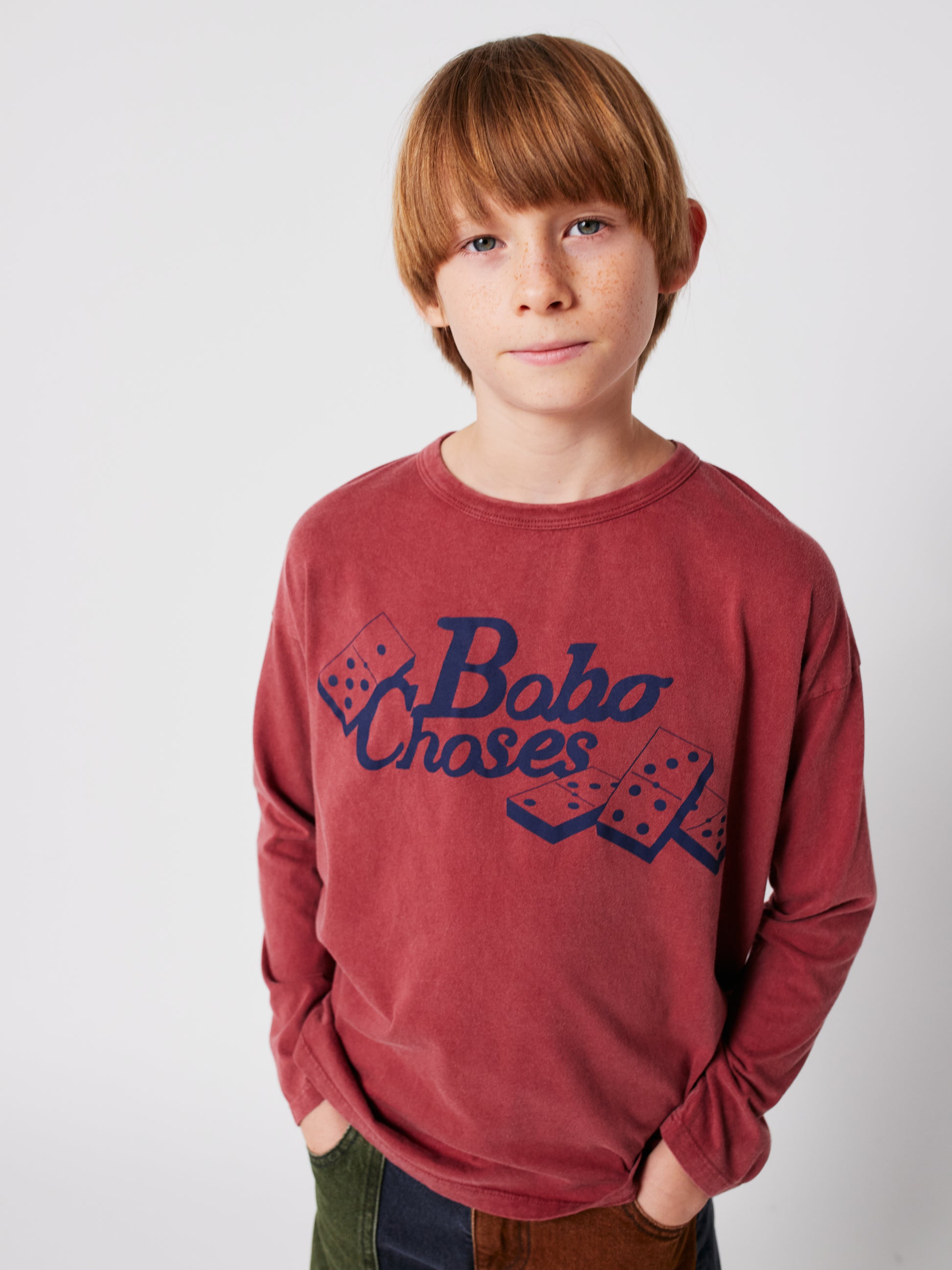 長袖,圓領,寬鬆設計。飽和復古的棕紅色配上經典的多米諾骨牌桌遊以及復古的Bobo Choses字體,給予孩子足夠的活動空間又不失品味。