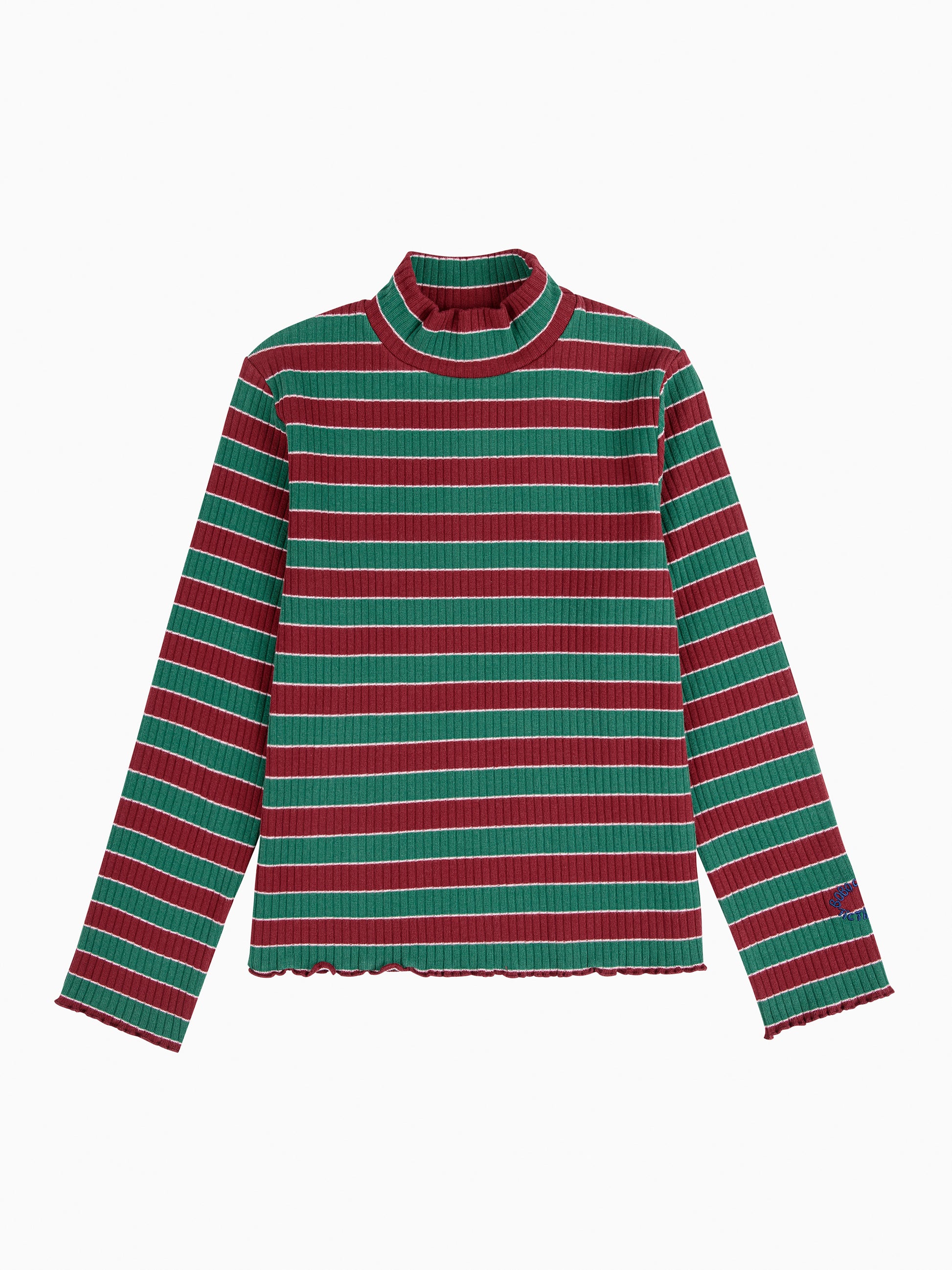 森林綠及勃根地紅兩種冬季顏色交錯的條紋搭配,加上合身以及小高領的設計,讓秋冬搭配變的更加的活潑!袖口繡上Bobo Choses Tic Tac Toe字樣,細節讓孩子慢慢品嚐挖掘!