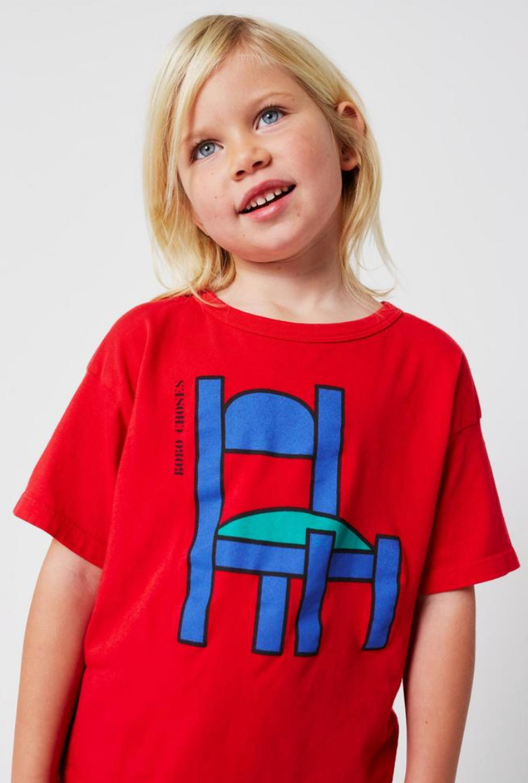 椅子 T 恤用一張椅子的想像,開啟無限的故事空間。這款紅色短袖 T 恤,採用 100% 有機棉製成,觸感柔軟親膚,適合日常穿著與探險時光。寬鬆版型搭配圓領設計,讓孩子自在活動不受束縛。