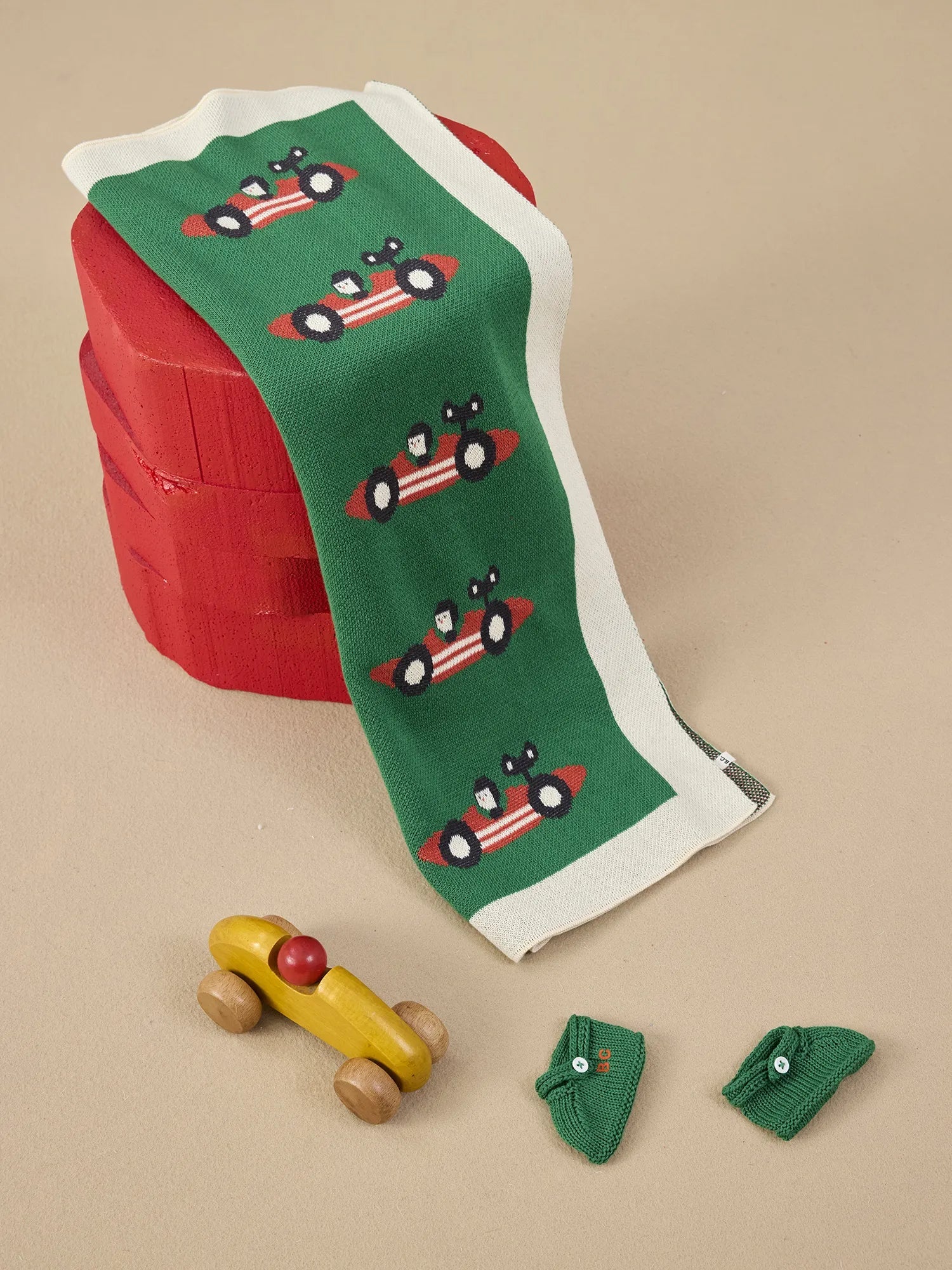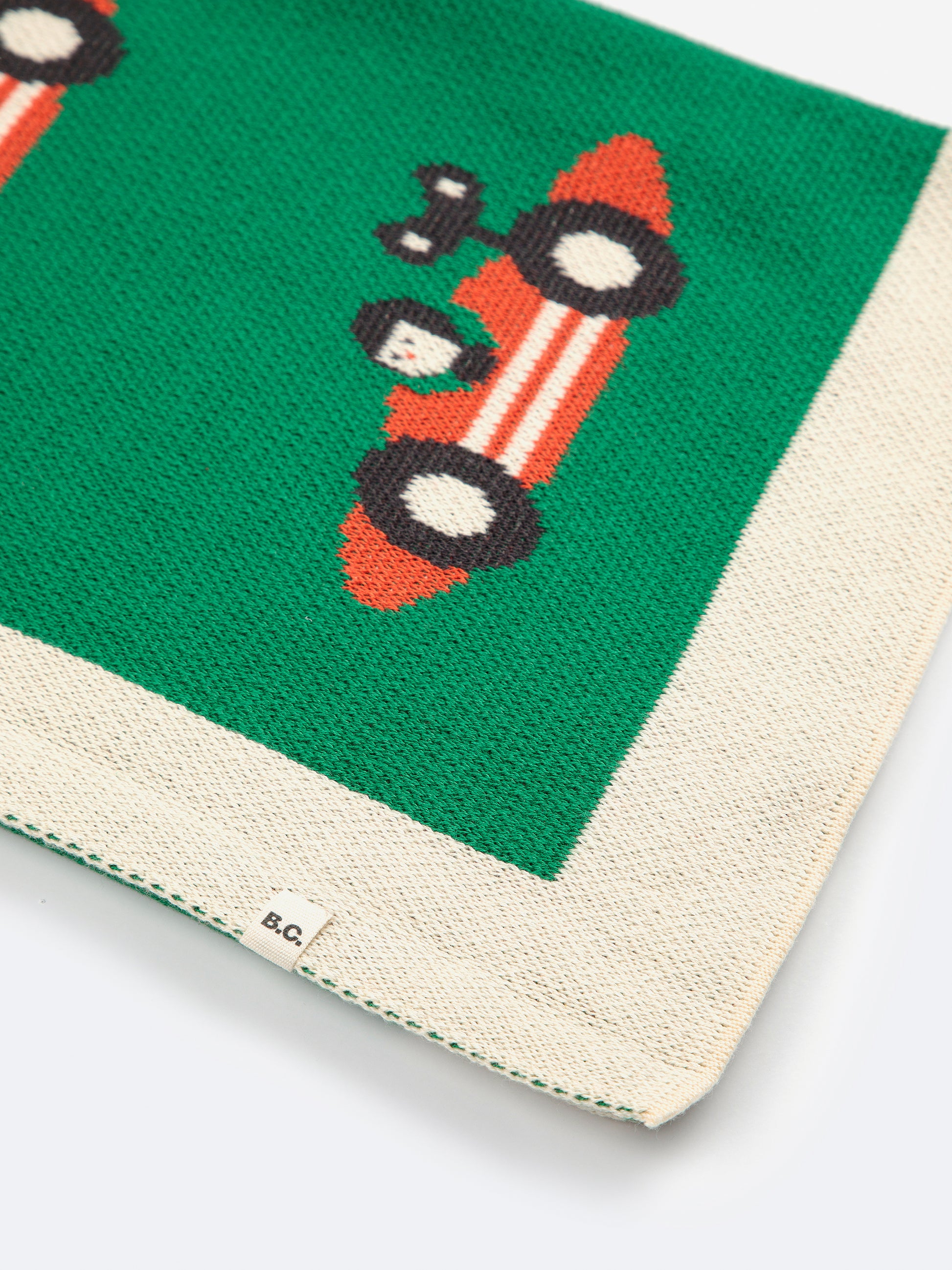 綠色有機純棉針織毯搭配復古紅色小賽車的提花圖案。