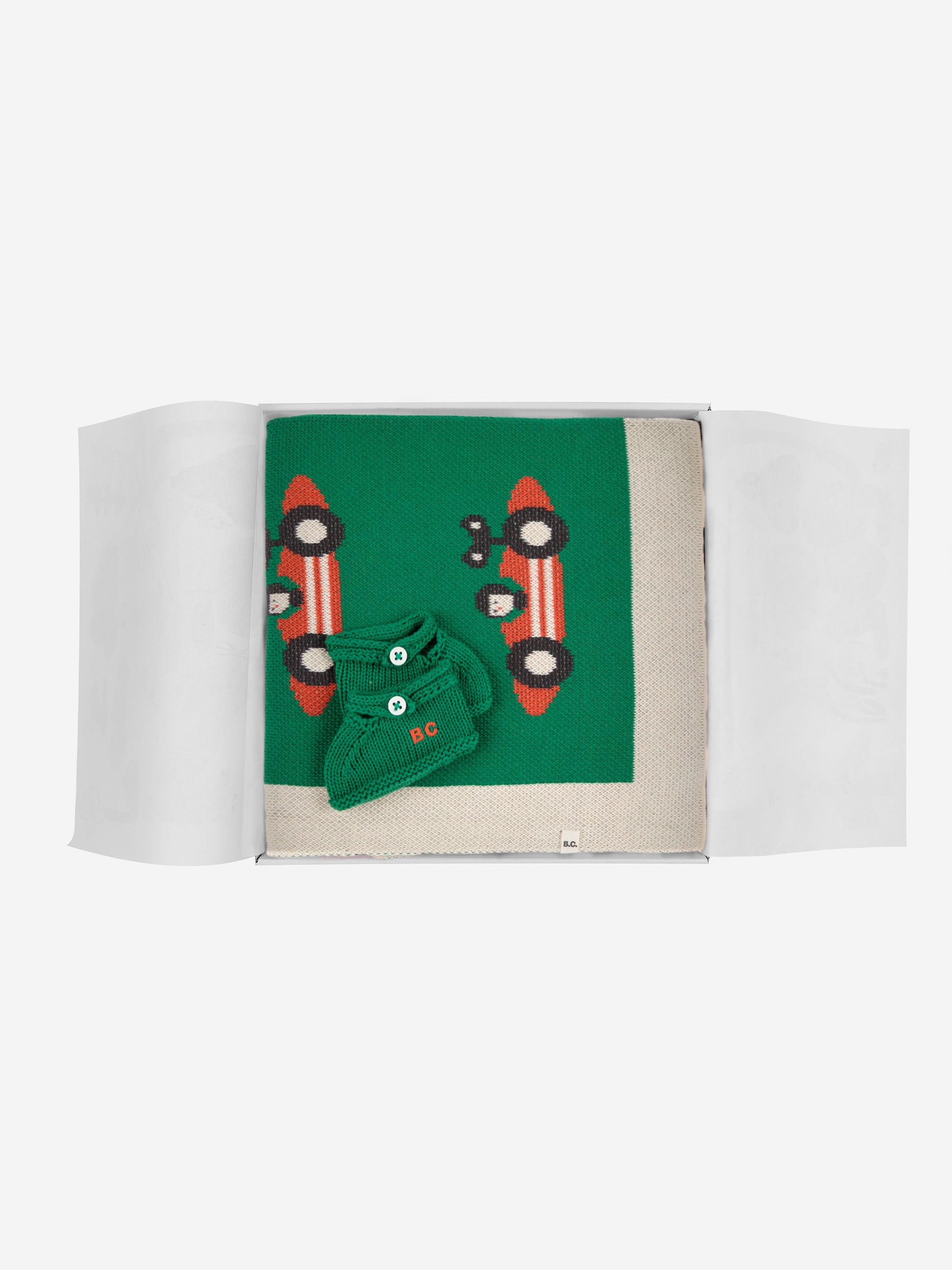 禮盒包含一條柔軟的有機純棉針織毯以及一雙紳士又保暖的有機純棉瑪莉珍小鞋。