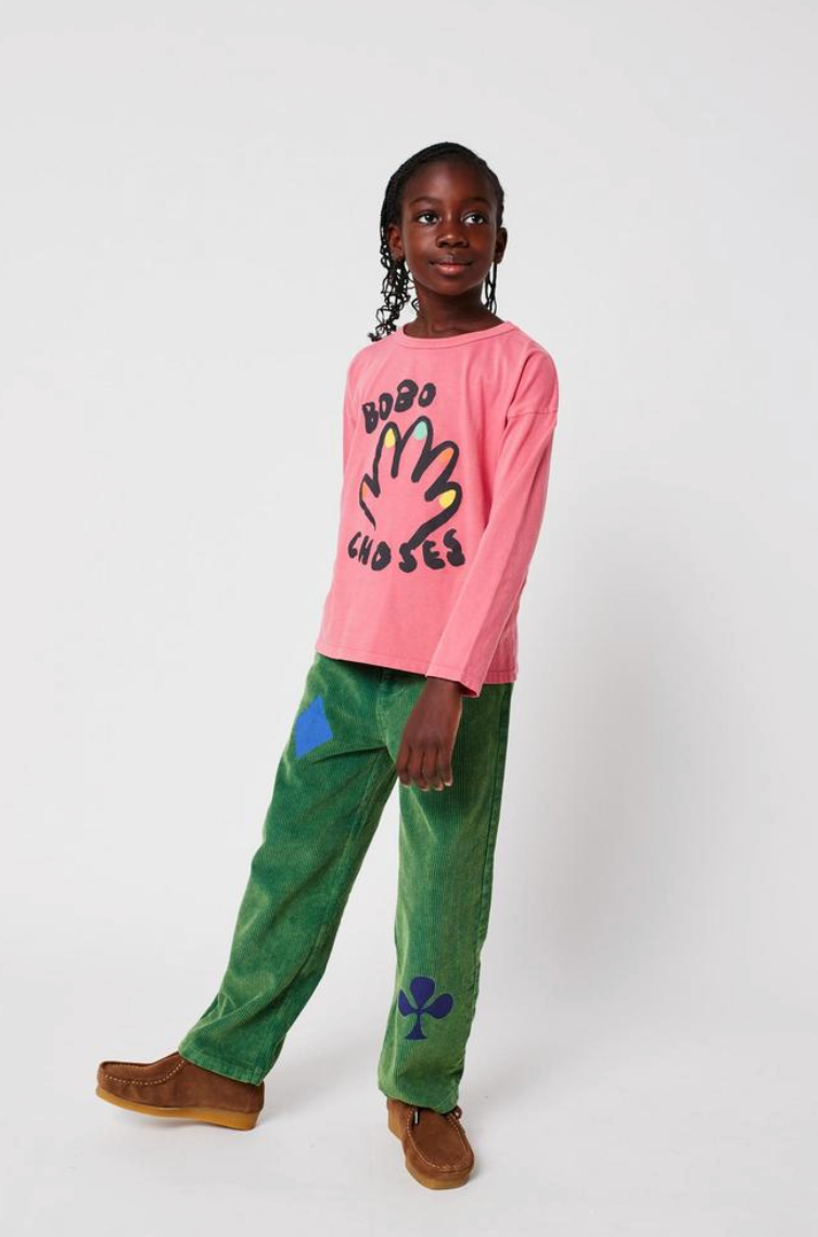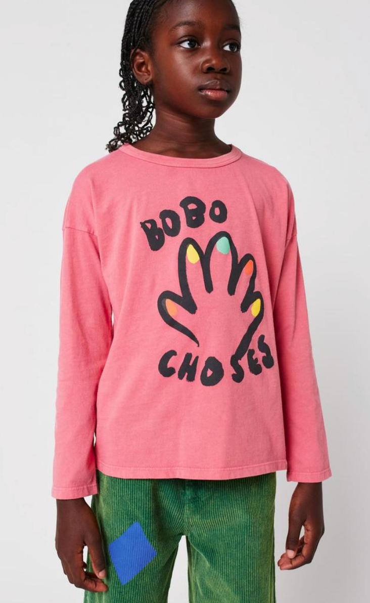 長袖,粉色T恤,寬鬆版型與圓領設計,男孩女孩都適合。