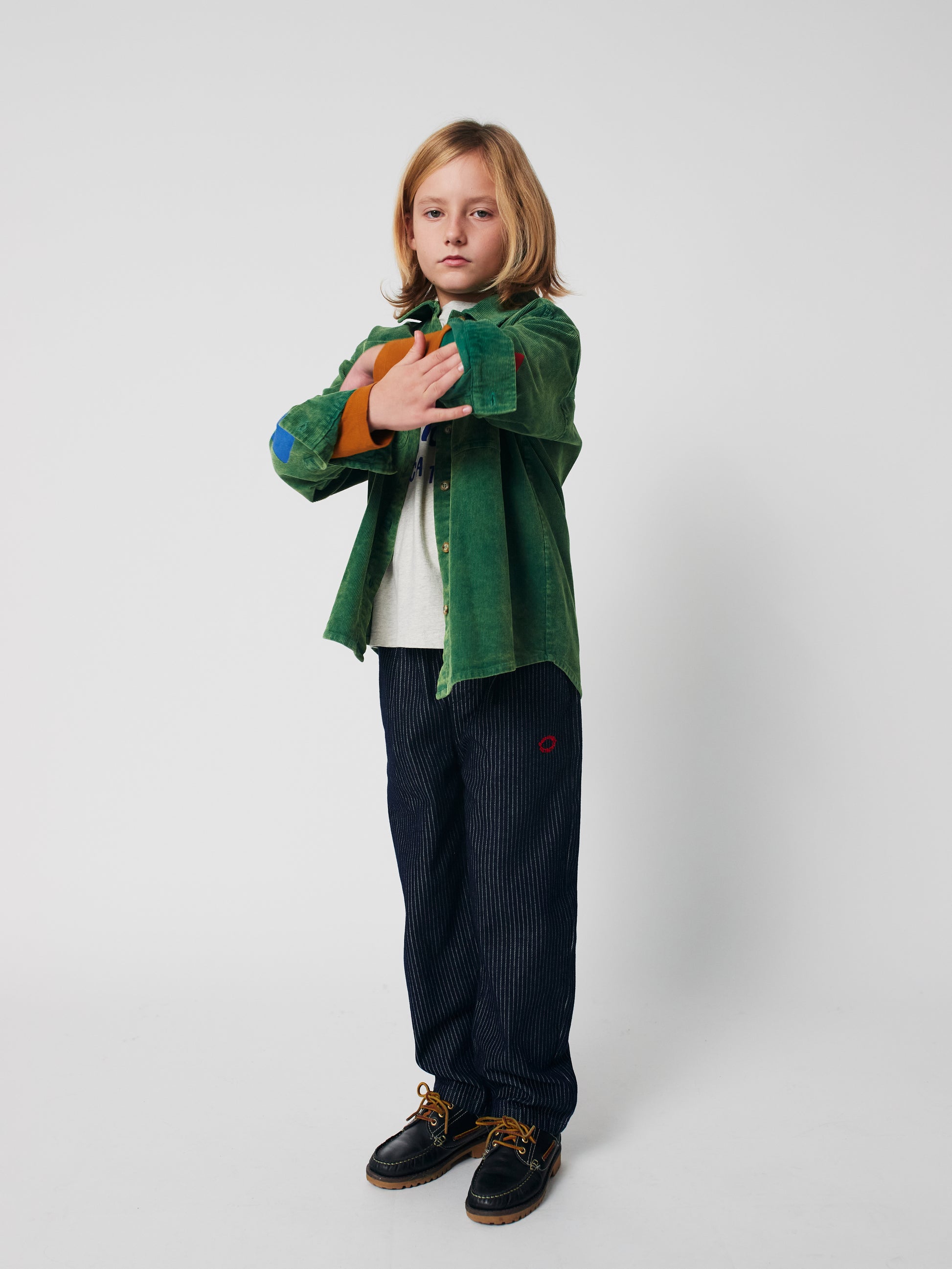斜口口袋,腰間有抽繩設計可隨著孩子成長調整大小。